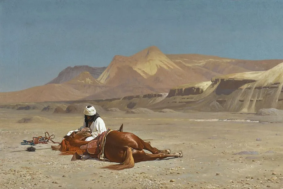 And then there’s Rider and His Steed in the Desert. A lone figure, motionless, sits atop his horse in the emptiness of sand and silence. There is no narrative, no drama… just presence. Gérôme positions us slightly behind and to the side, as if we’ve paused on our own journey and are watching this one unfold in parallel. The desert stretches endlessly around them. Nothing moves. And yet, something in the stillness speaks. We are not part of the scene: we are witnessing it, quietly, from a respectful distance.