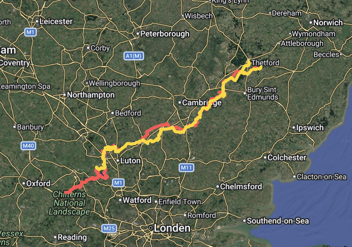 The Icknield Way stretches about 130 kilometer, running from Norfolk down to Wiltshire. Much of it hugs the edge of the chalk hills, especially the sweeping scenery of the Chiltern Hills. Walking it probably feels like drifting through a painting. Open skies, soft white paths, rolling fields, hedgerows buzzing with life, and villages that seem gently preserved by time.