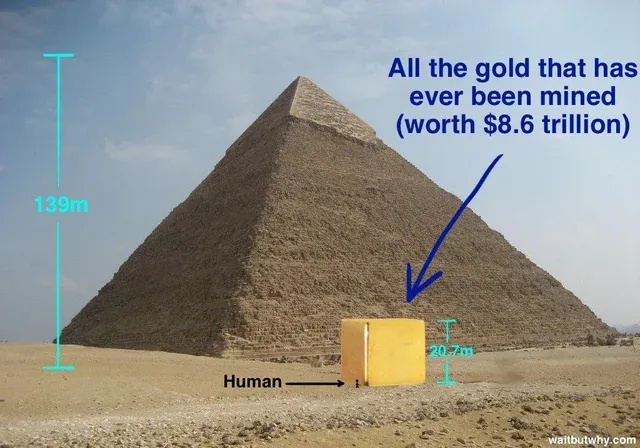 Even better: if you melted down all the gold humans have ever mined (every crown, vault bar, statue, and tooth filling) it would form a cube about 22 meters tall. About the height of a small apartment building. That’s it.